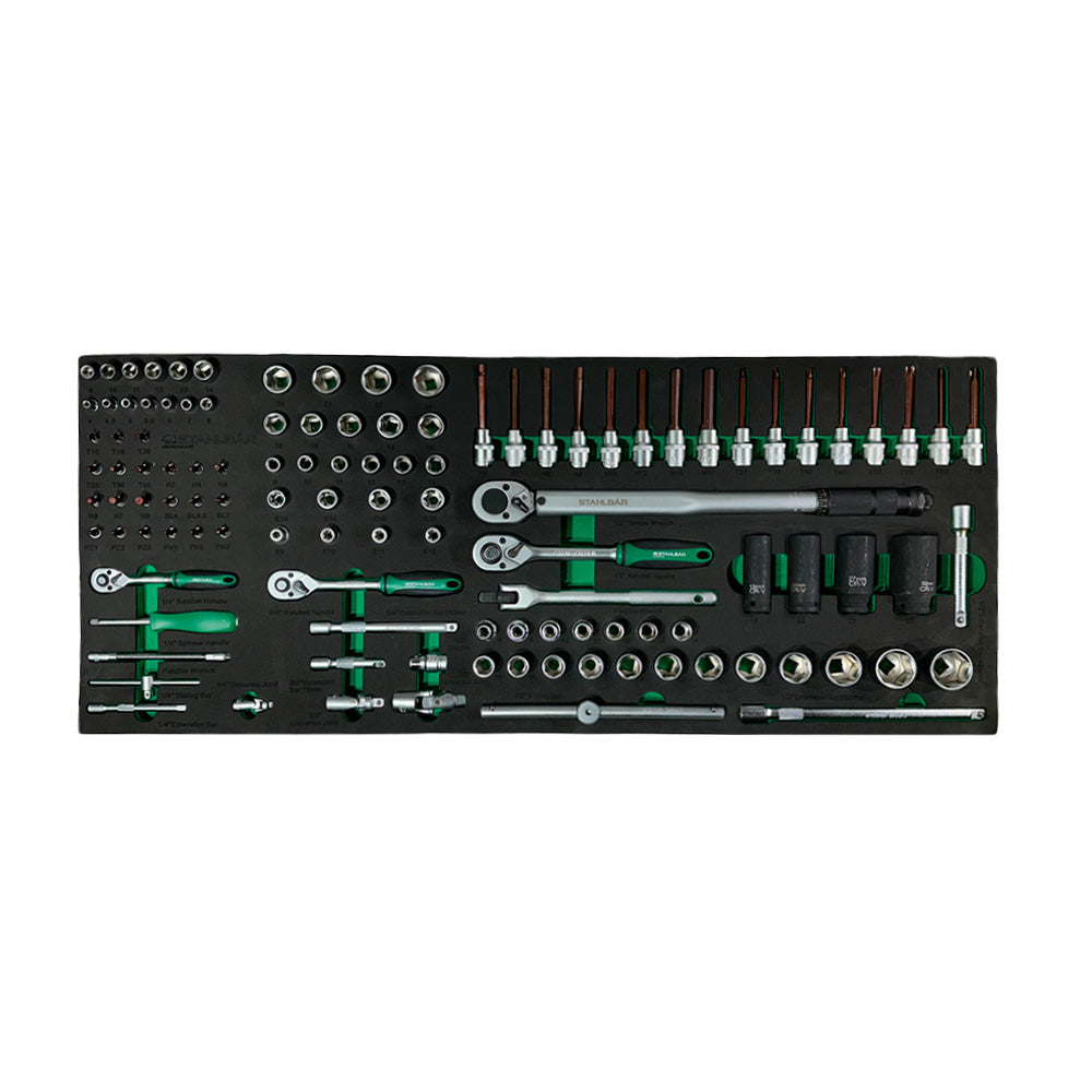 - Szuflada 1 – Zestaw nasadek, grzechotki, przedłużki i akcesoria