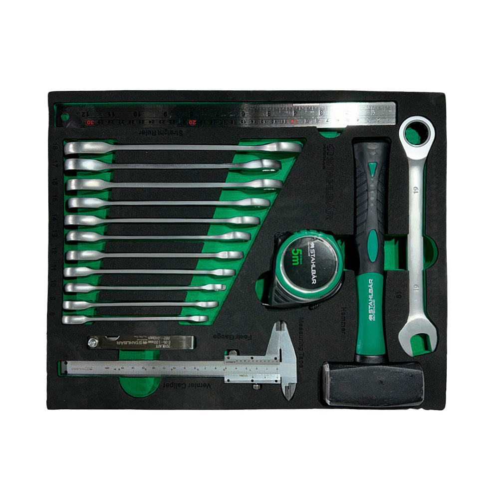 - Szuflada 5 – Klucze płasko-oczkowe, narzędzia pomiarowe, młotek